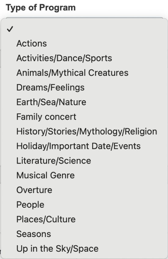 In Advanced Search, click "Type of Program" and a dropdown menu appears. Here, you can select a few beginning thoughts to help you on your concert programming journey.